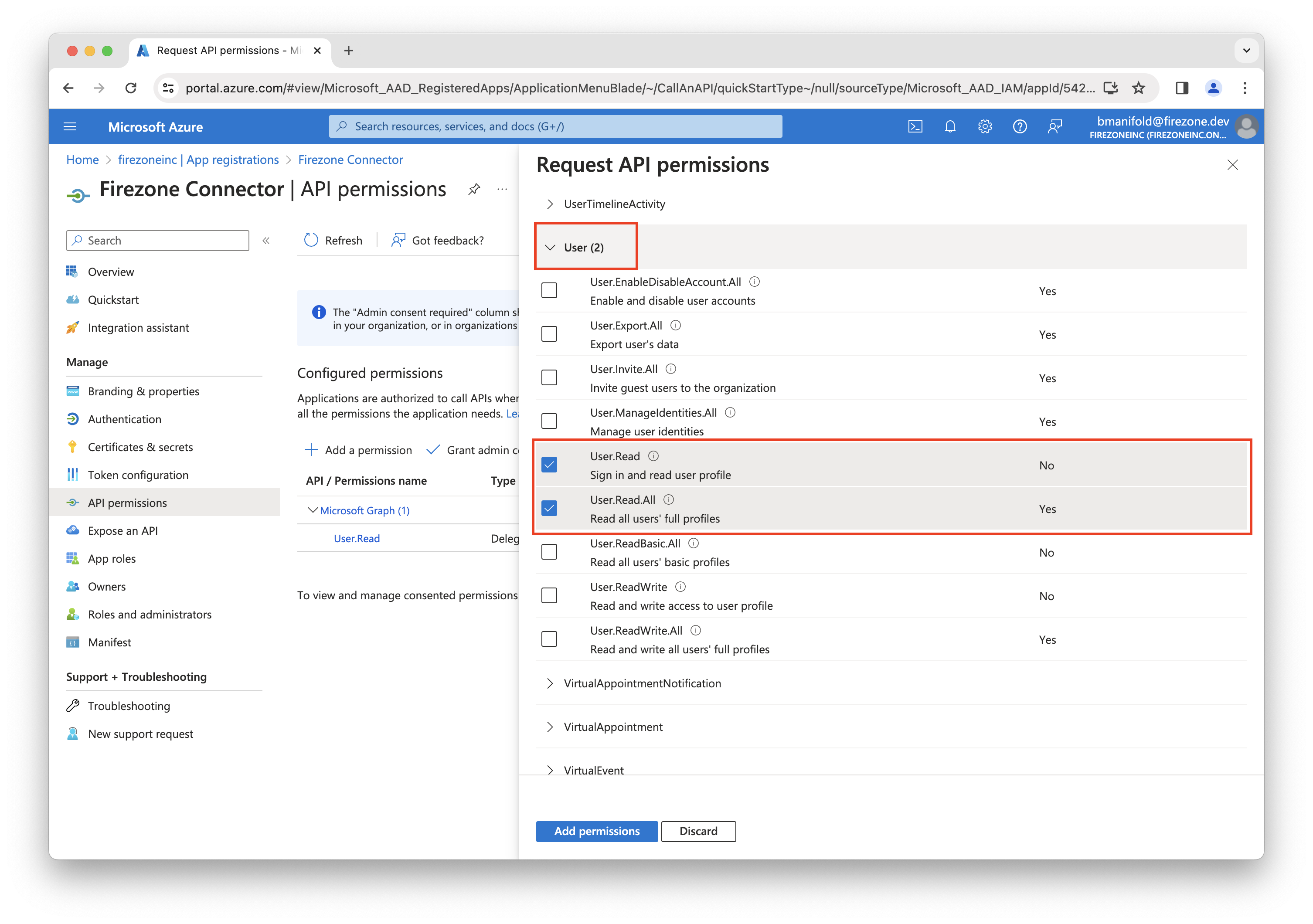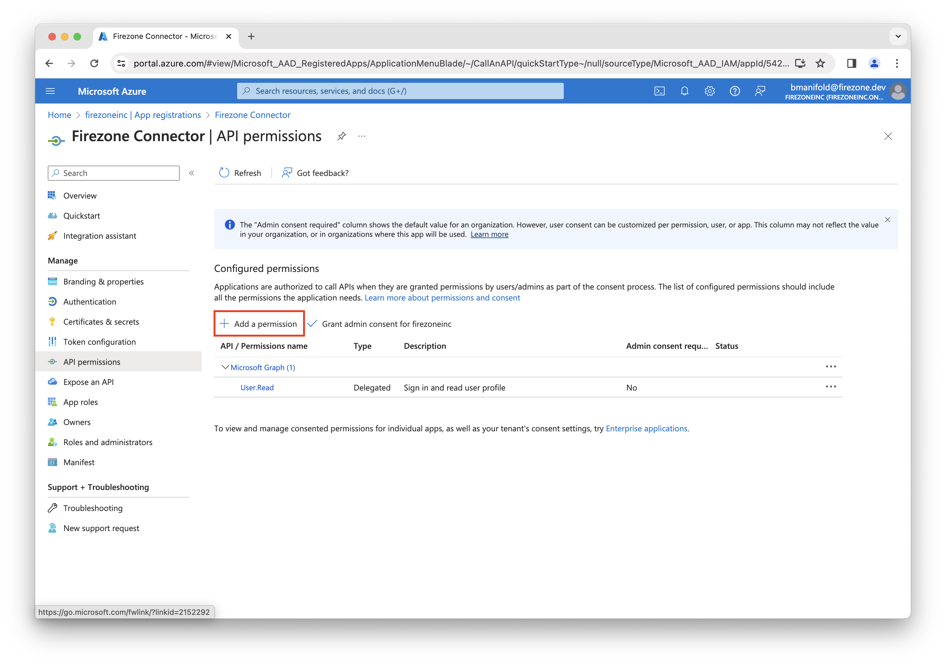 Next, you'll need to add permissions to the app registration to allow Firezone to read user and group data from your Entra ID account.