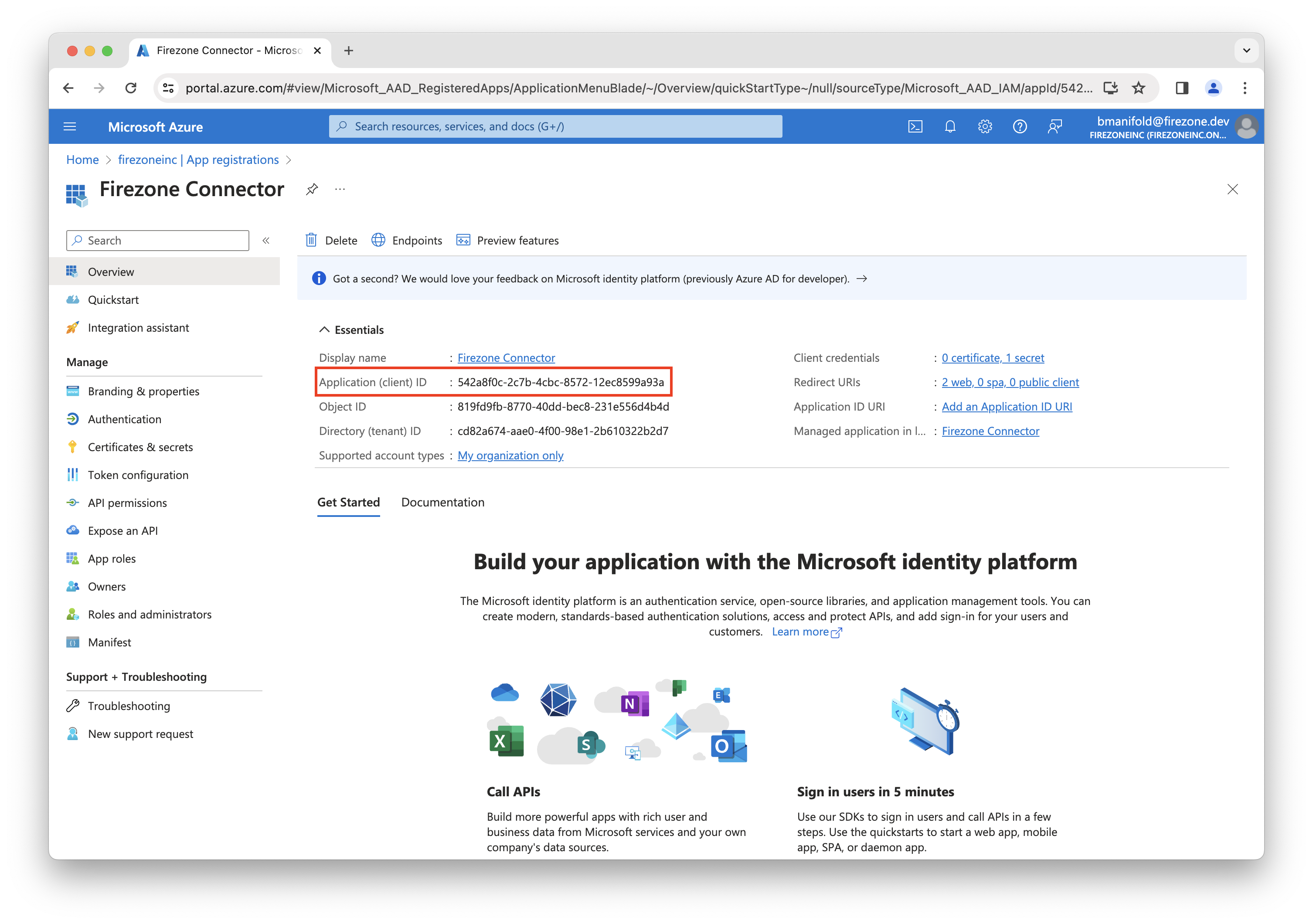 the app registration to enter into the Firezone admin portal.
