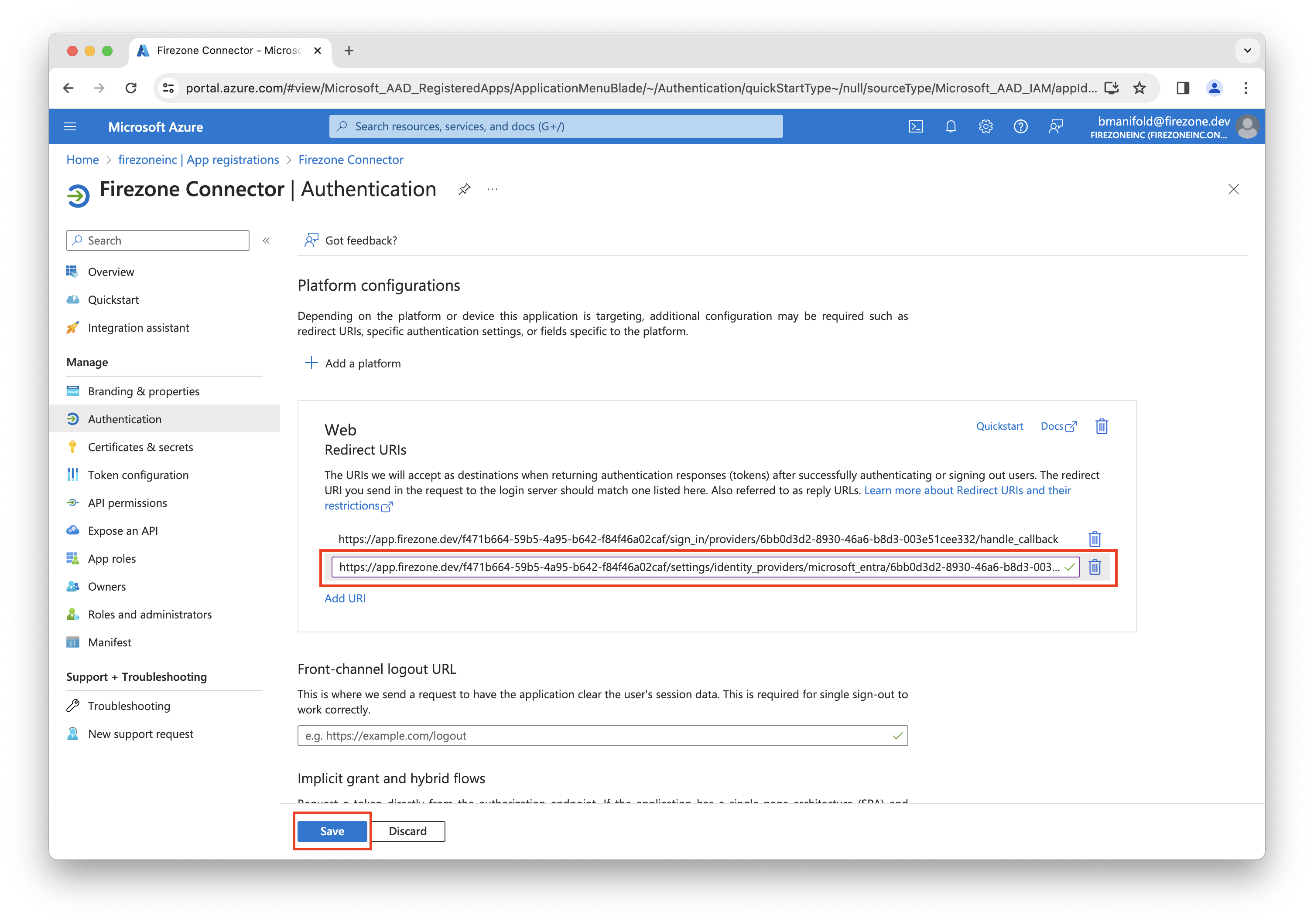 Enter the second Redirect URI shown in the setup page from the Firezone admin portal and click Save.