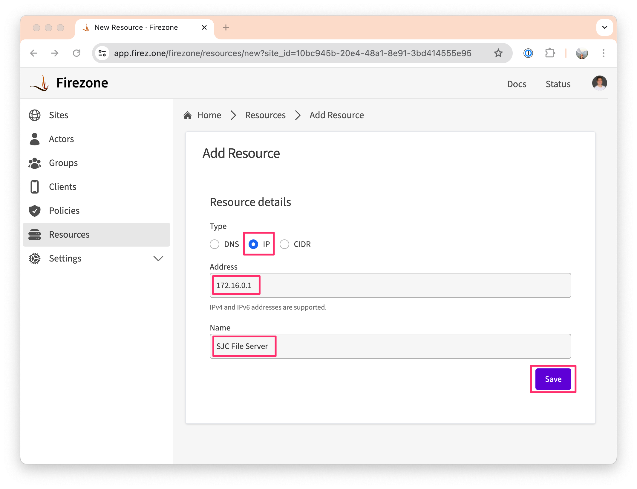 4. Name the Resource something descriptive, like SJC File Server. You'll refer to this name when creating a Policy in the next step.